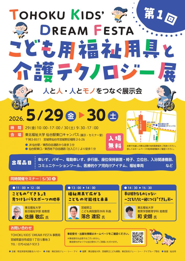 NPO法人ハローとの共催にて、展示会「第1回 TOHOKU KIDS’ DREAM FESTA こども用福祉用具と介護テクノロジー展」を開催します。